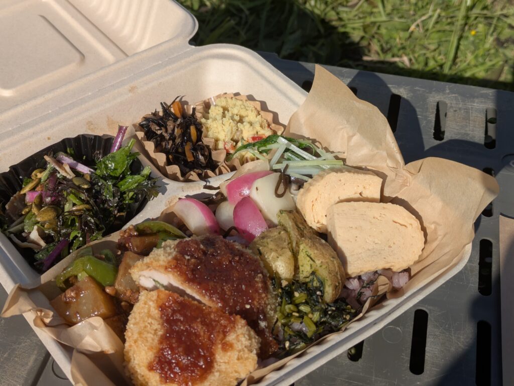 畑作業の合間に運ばれてきたのは、工藤さんのお野菜がふんだんに使われた特製のお弁当。